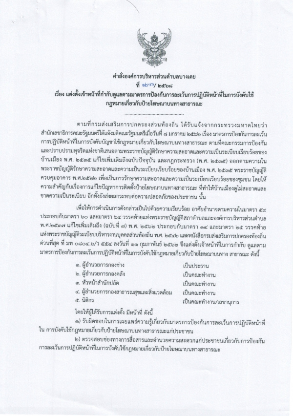 คำสั่งองค์การบริหารส่วนตำบลบางเตย ที่ 1266/2568 เรื่อง แต่งตั้งเจ้าหน้าที่กำกับดูแลตามมาตรการป้องกันการละเว้นการปฏิบัติหน้าที่ในการบังคับใช้กฎหมายเกี่ยวกับป้ายโฆษณาบนทางสาธารณะ
