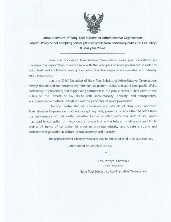 ประกาศนโยบายไม่รับของขวัญและของกำนัลทุกชนิดในการปฏิบัติหน้าที่ (No Gift Policy)